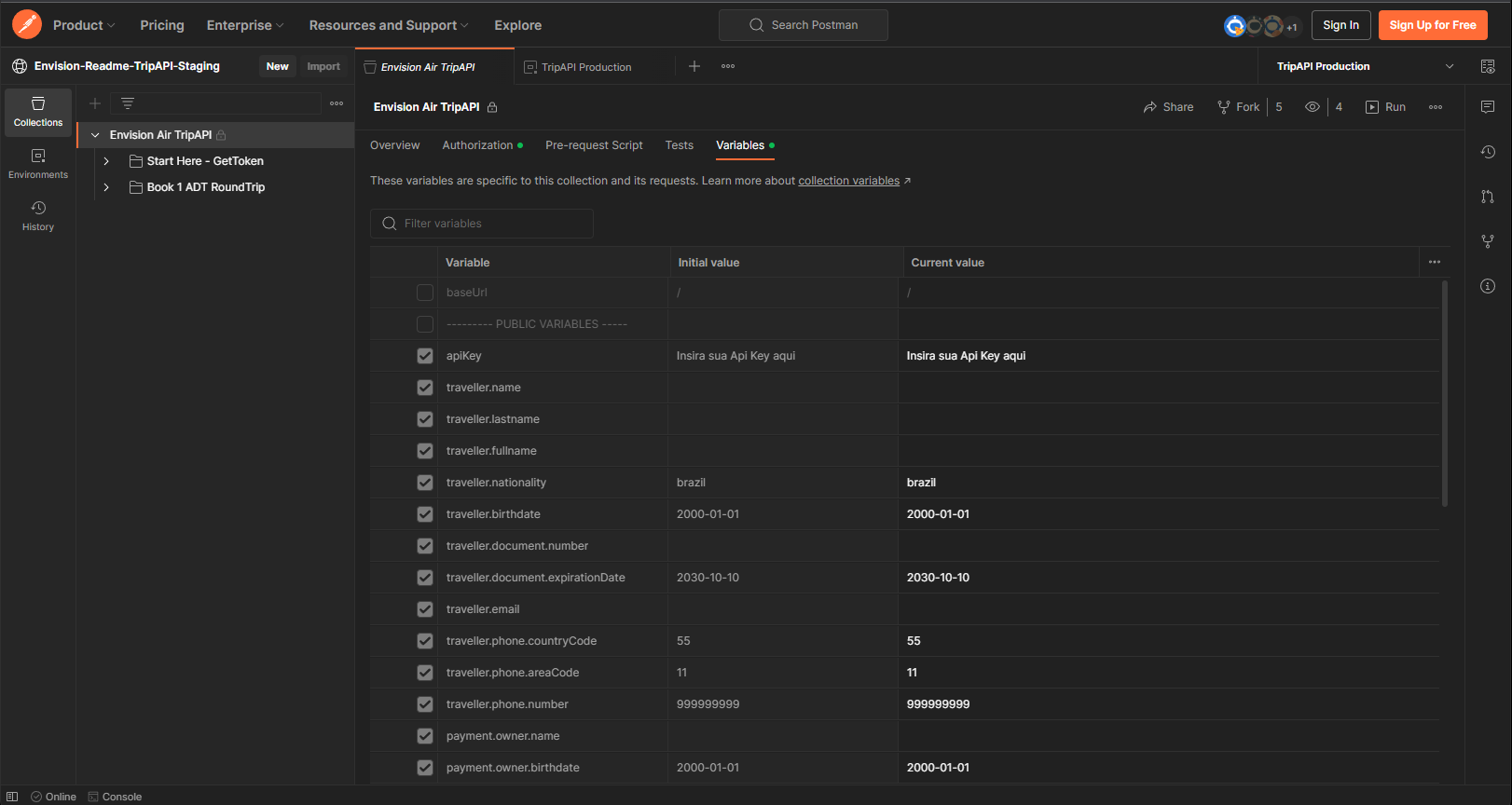 Na página de "variables", temos que editar todas as variáveis públicas para que o fluxo funcione corretamente como nomes de passageiros e se necessário emitir, dados de cartão de crédito.