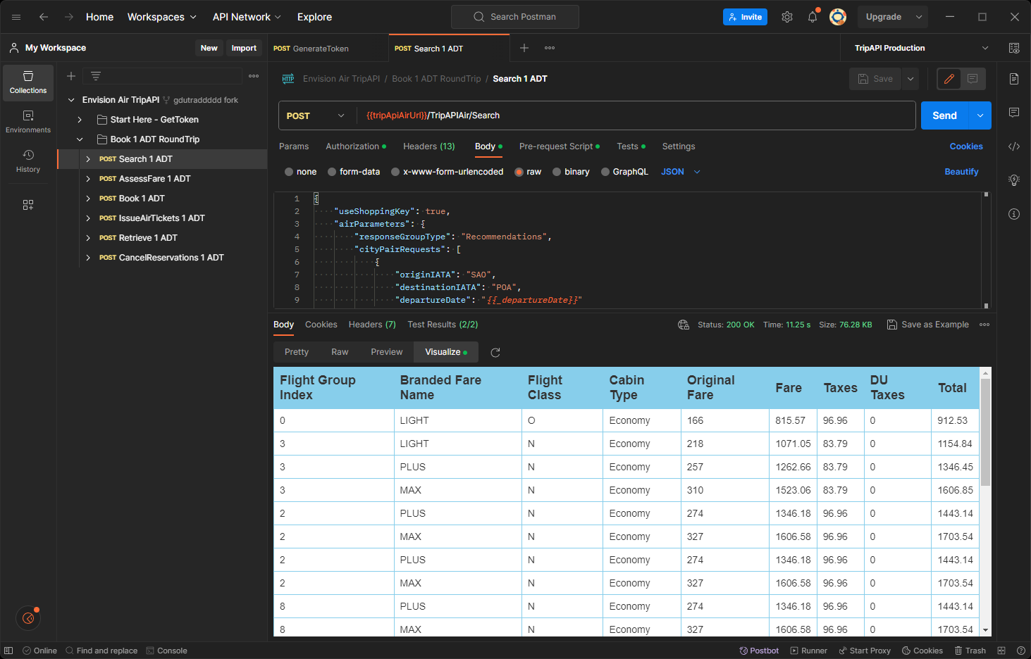 A collection possui uma pasta chamada "Book 1 ADT RoundTrip", que realiza o fluxo completo, onde é feita uma busca(Search), tarifação(AssessFare), reserva(Book), emissão(IssueAirTickets), retrieve e por fim o cancelamento da reserva(CancelReservations).