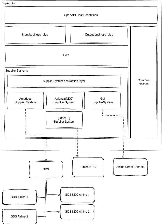 Além disso pode se considerar que estão nesta camada todas as implementações específicas de cada SupplierSystem como: Copa, Avianca, Latam, Iberia, Amadeus, Sabre, Gol, Azul, Latam, entre outros.